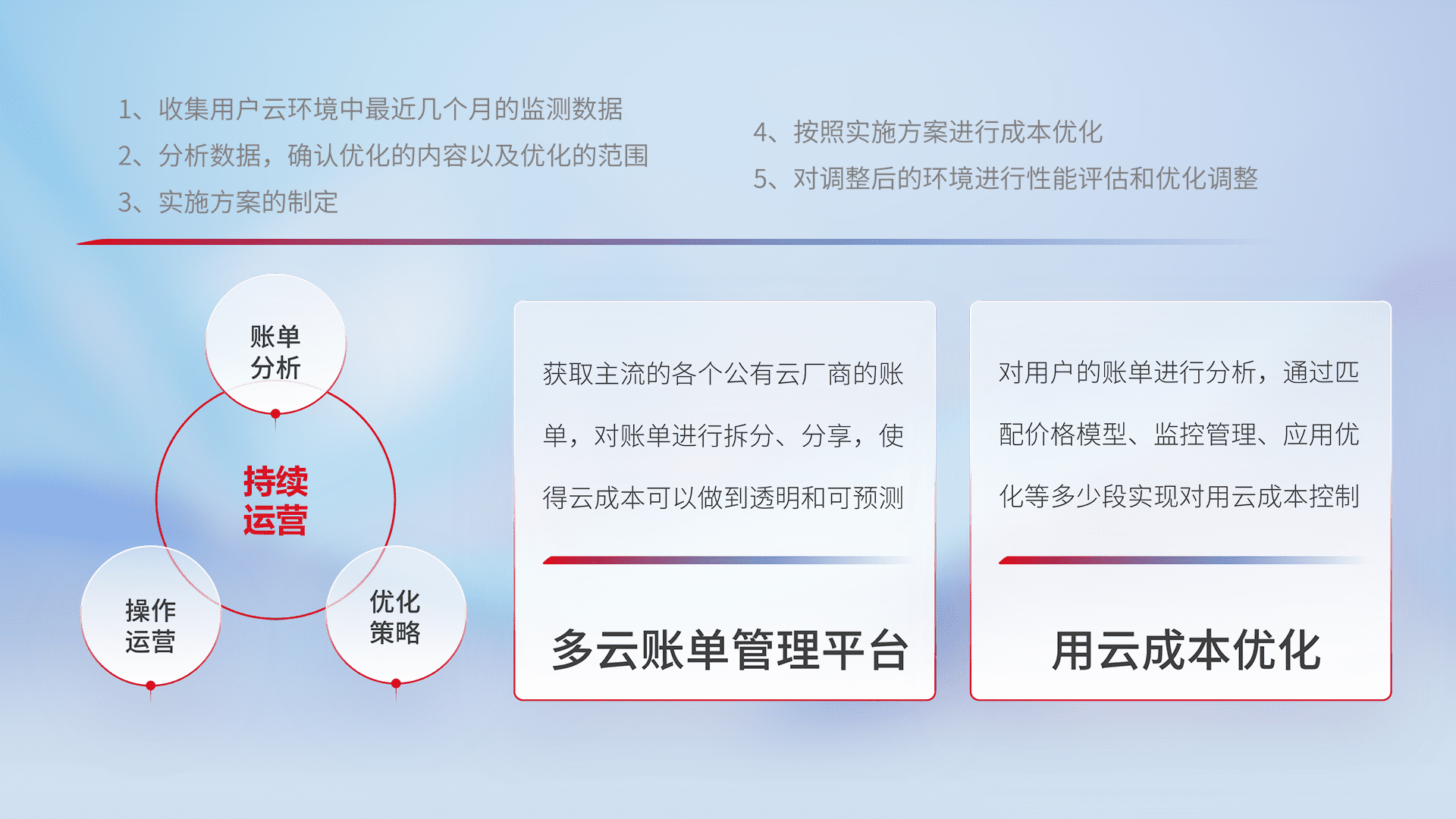 通过多云纳管,,,以统一的资源数据模型把客户的云资源进行抽象和封装,,进而实现对多云资源的统一操作,,,,保障云资源管理的可靠性、、、、稳定性与可用性。。量身定制化运维内容,,,,配置、、开发运维、、补丁管理、、、备份、、、、监控、、认证和访问管理、、、、审计和日常巡检等,,保障在用云过程中的可靠度,,稳定度以及高可用率。。。。